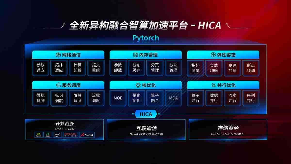 通过自研的服务层、、、、中间适配层、、、、以及调度编排算法,,,采用数据并行、、模型并行等多种并行方式,,,,把并行计算任务进行有效的分解,,,使其分别由相应的软件栈和算力资源来承接。。。。当GPU资源变化,,HICA可以实时动态调度计算子任务并调整模型拓扑和架构,,,以充分聚合各种算力资源。。